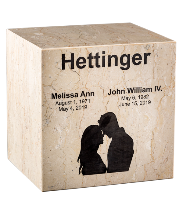 This marble urn will create a dignified resting place for eternity to come. This classic urn is a square urn with two threaded screw openings at the bottom to keep the contents within secure. This urn is perfect for the couple who wants to be together for eternity. Cameo marble is tan in color with white and brown veining.