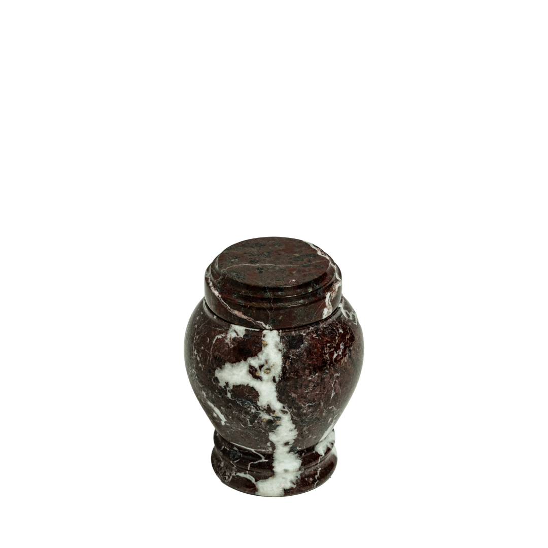The Embrace Red Zebra Keepsake features light-to-deep brown tones and intricate veining, offering a natural, wood-inspired look in polished marble. Each Embrace urn is crafted from a single block of marble for durability and a seamless finish. The top-opening lid can be sealed permanently with the included adhesive. Each Embrace Keepsake takes our artisan 3 hours to complete.