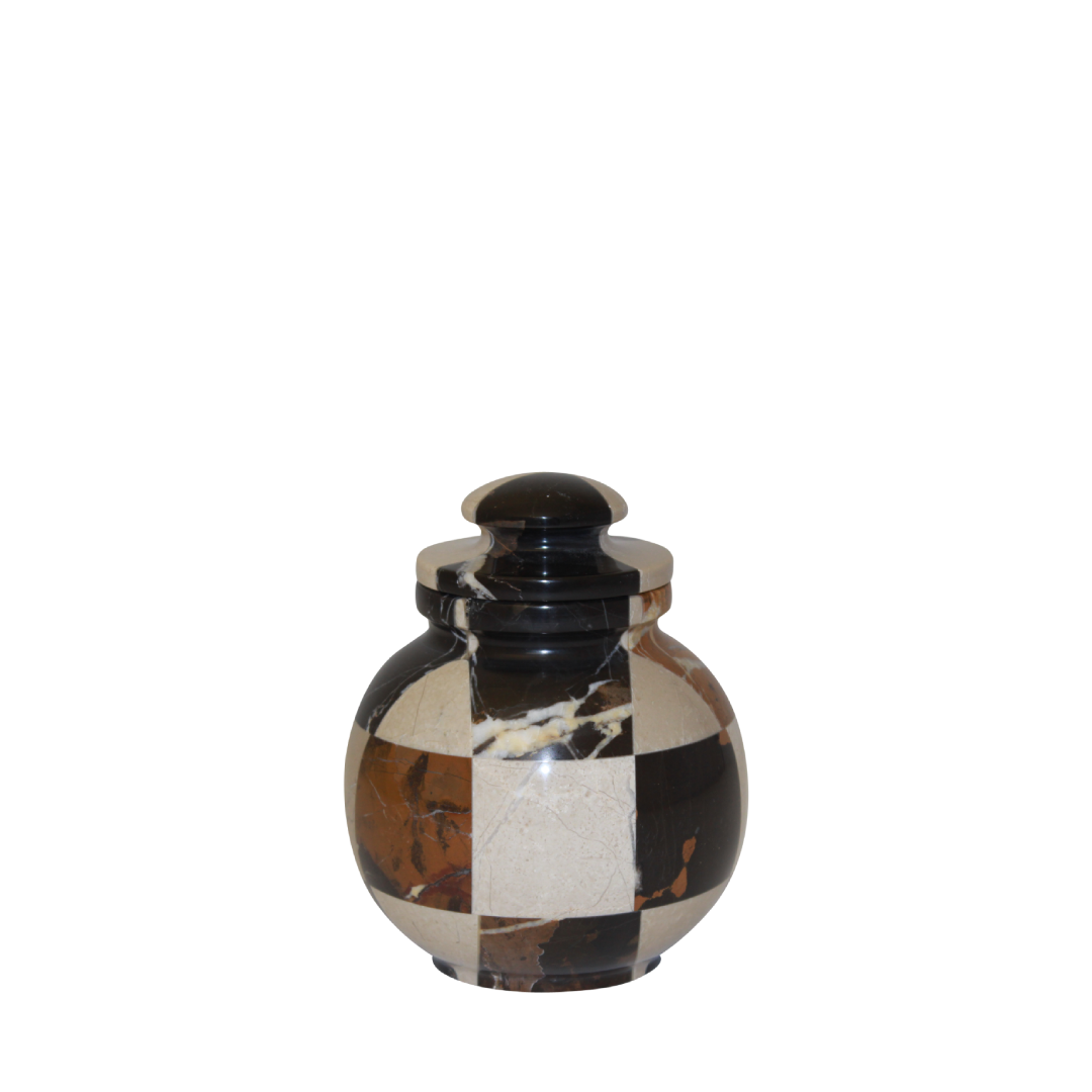 R&S Design Gallery is proud to introduce this newly crafted Triumph Cameo & King Gold urn as a part of the Mosaic urn line, made from some of the most beautiful natural stones around; The cameo marble and king gold marble. This urn is hand crafted and pieced together with the newest techniques in the industry. Each urn is made up of 25 individual marble pieces and placed in a mosaic pattern for a one of a kind design. The matching lid is also pieced together from 4 individual marble pieces and helps to carry out the pattern throughout the urn. Each Triumph Cameo & King Gold urn takes our artisan three hours to complete, making each urn a true piece of art.