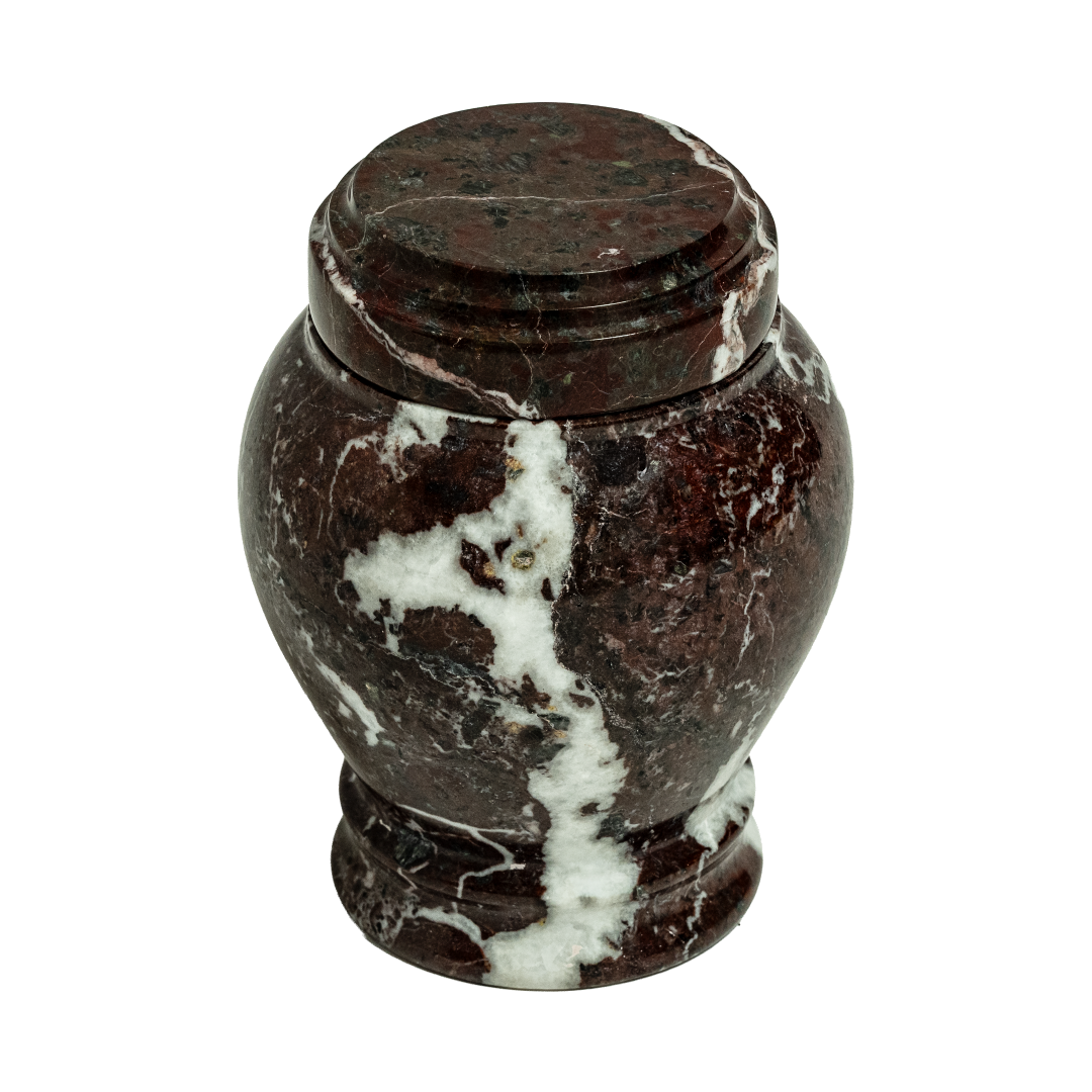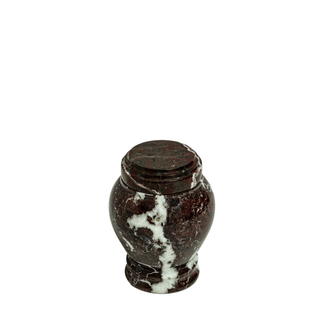The Embrace Red Zebra Keepsake features light-to-deep brown tones and intricate veining, offering a natural, wood-inspired look in polished marble. Each Embrace urn is crafted from a single block of marble for durability and a seamless finish. The top-opening lid can be sealed permanently with the included adhesive. Each Embrace Keepsake takes our artisan 3 hours to complete.
